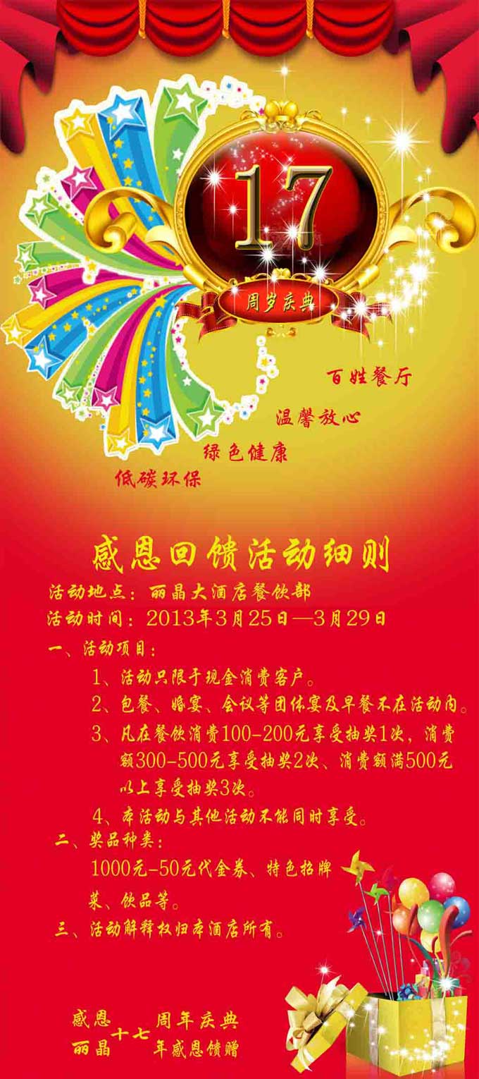 3、凡在餐飲消費(fèi)100——200元享受抽獎(jiǎng)1次,消費(fèi)額300——500元享受抽獎(jiǎng)2次,消費(fèi)額滿500元以上享受抽獎(jiǎng)3次。